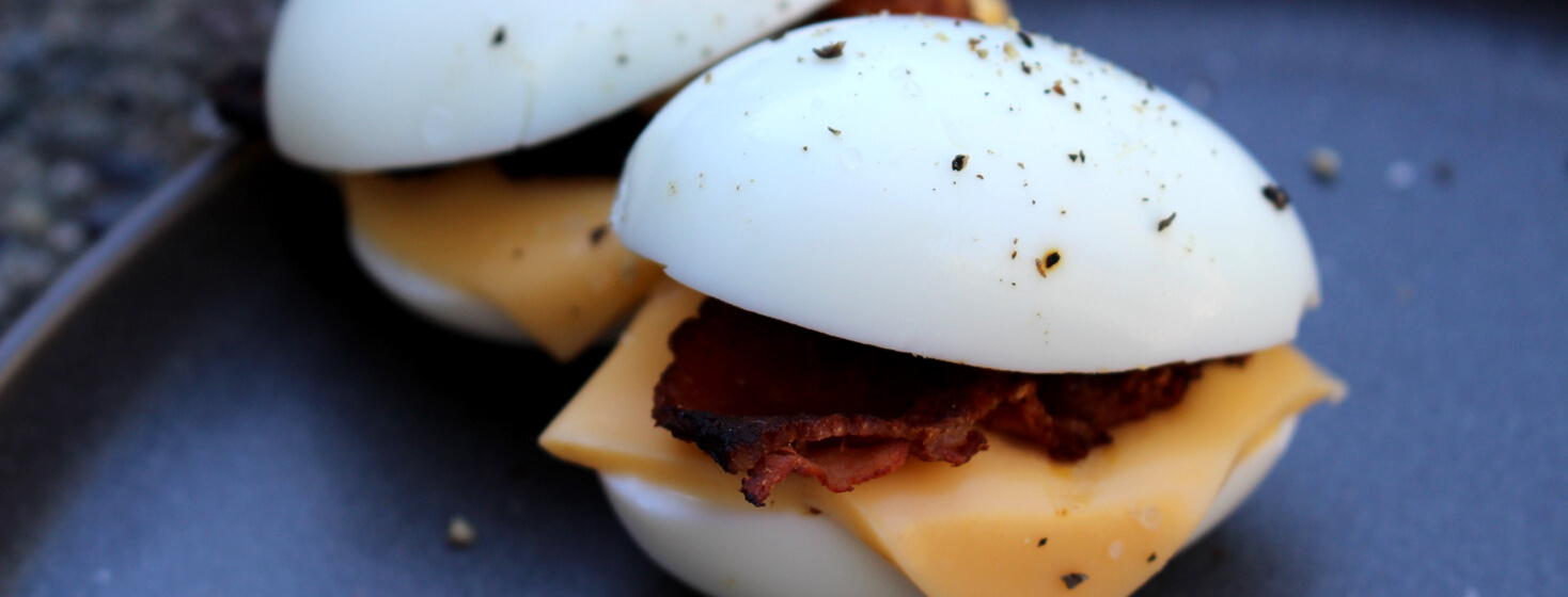 - Slice eggs horizontally to open then add a cheese slice and bacon piece.