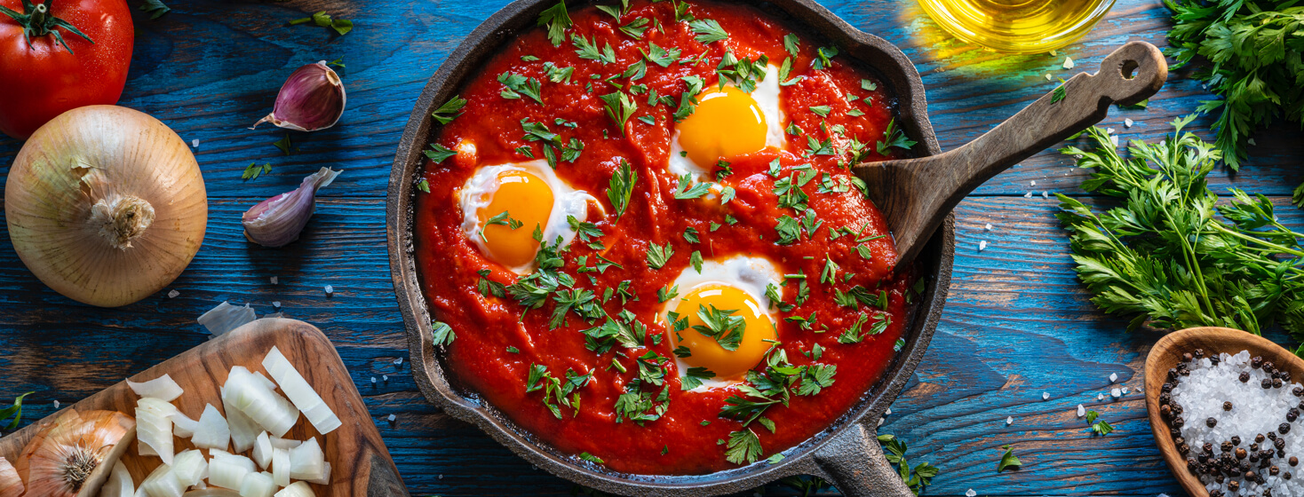 Eggs are one of the most versatile foods. They can be eaten for breakfast, lunch, and dinner. The ways to cook them are innumerable! Try this new recipe for any of your meals. Cooking the eggs in tomato sauce gives a nice, soft texture and an amazing flavor!