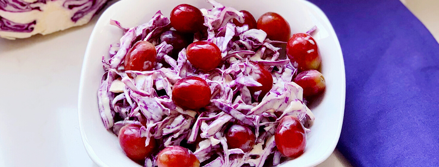 This red cabbage slaw has the textures and tastes to drive your senses wild. Crunchy cabbage. Silky smooth yogurt. Juicy grapes. Warm spices. It’s a drool-worthy dish that will become an instant crowd favorite. But, aside from its uniquely delicious taste, it’s also a one-stop-shop to wholesome nutrition.